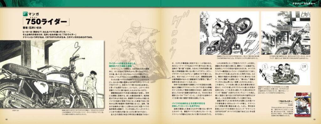 70~80年代のバイクブームにおけるムーブメントのひとつ「ナナハン(=750ccバイク)」。当時のライダーはもちろん、ナナハンに憧れた幼年時代を過ごした読者にとって、憧憬を覚えるキーワードだ。この章では漫画や映画、当時のバイクのカタログやバイクグッズなどを通じ、ナナハン文化を振り返る。