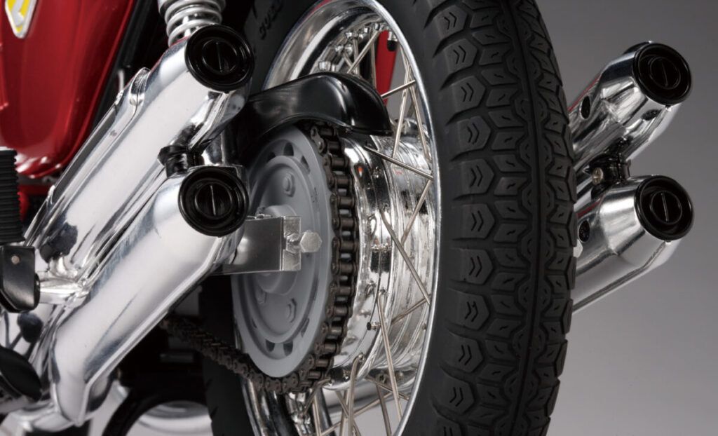 駆動系には、金属製のローラーチェーン&スプロケットを採用。あえて塗装は施さず磨きあげることによって特有の質感を再現。