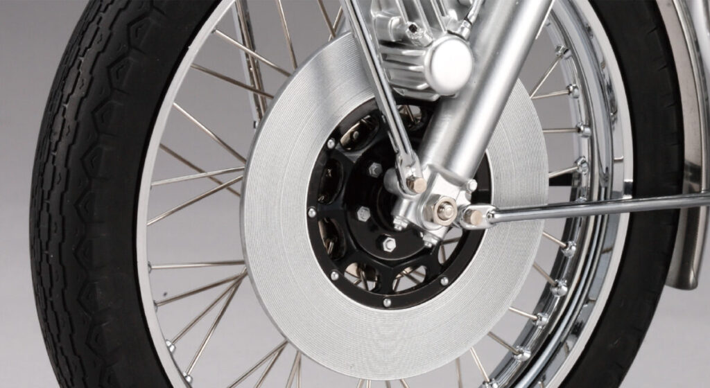 量産モデルとして初採用されたディスクブレーキは、ローター表面のヘアラインまでも再現。