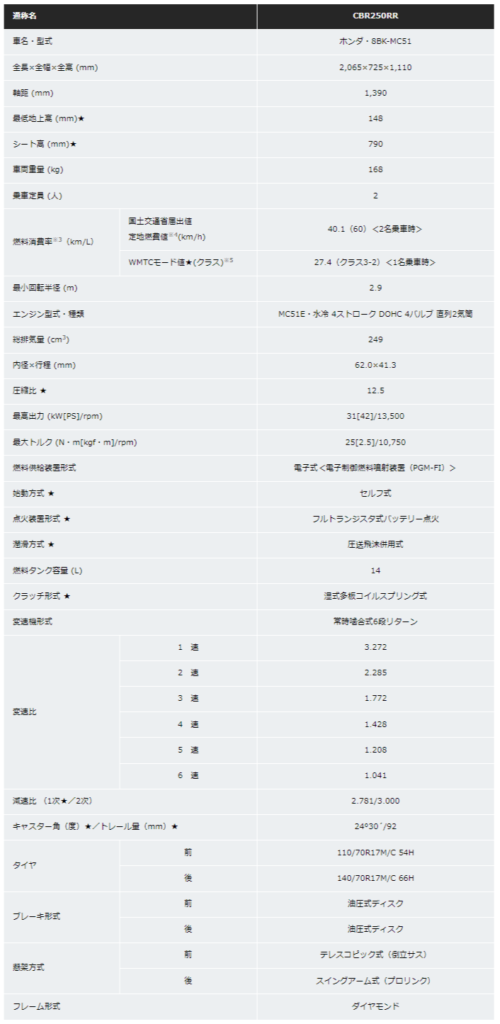 ■道路運送車両法による型式認定申請書数値(★の項目はHonda公表諸元) ■製造事業者/本田技研工業株式会社