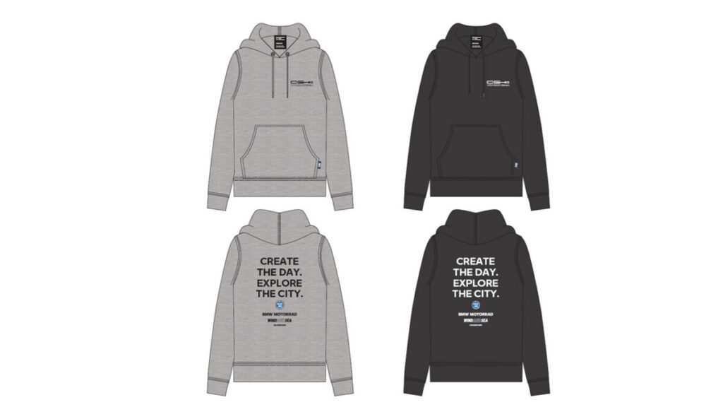 今回 CE 02 と WIND AND SEA のコラボレーションを記念して、Tシャツもしくはパーカーの限定アイテ ムを抽選で 100 名様にプレゼントします。若者たちに CE 02 の機敏さと創造性をイメージさせる WIND AND SEAによる特別デザイン。BMW Motorrad Japan の公式サイトのキャンペーンページより ご応募ください。
