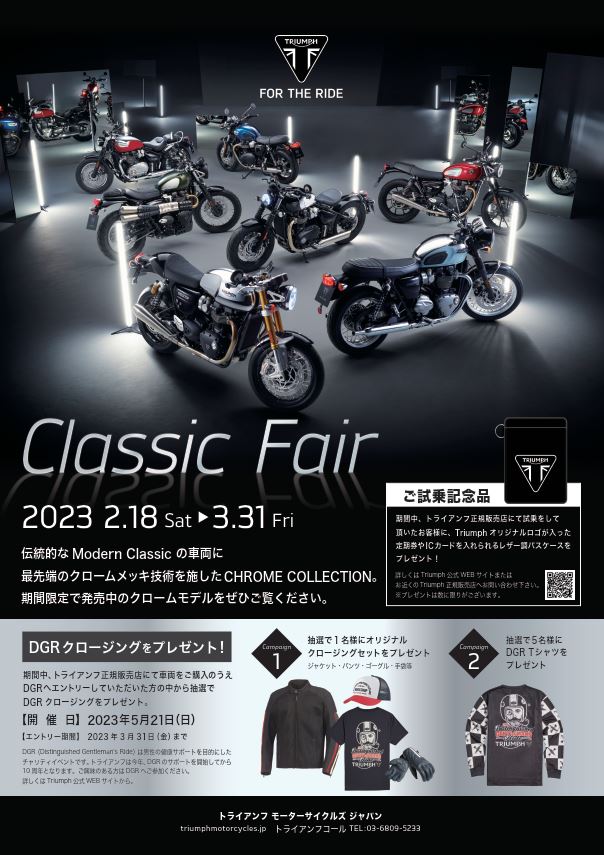 18 日 より全国のトライアンフ正規販売店において、伝統的な Modern Classic や Modern Classic 車両に最先端のクロームメッキ加工を施した CHROME COLLECTION を含めた、「Classic Fair」を開催することをお伝えいたします。