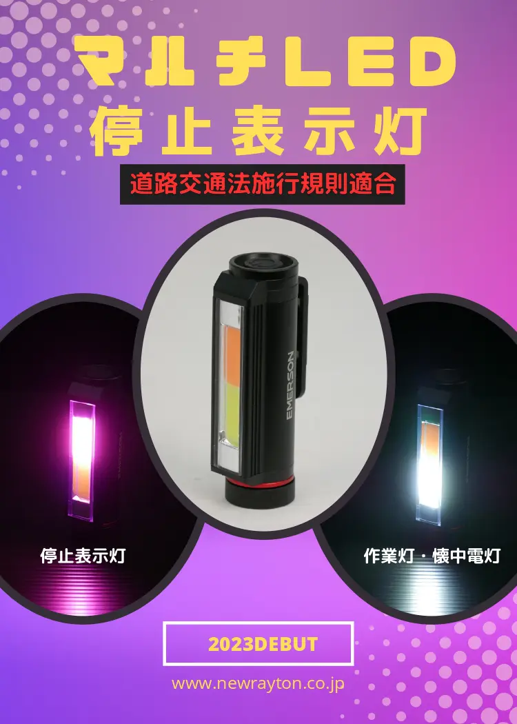 自動車やバイク用品の製造・販売を行うニューレイトン株式会社は、自動車用品ブランドEMERSON(エマーソン)の停止表示器材「マルチLED停止表示灯」を、2023年6月上旬より販売開始する。また、発売に先がけ一部ECサイトにて先行予約の受付を開始した。同製品は、停止表示灯にLEDを採用し軽量・コンパクト化することで、従来の三角停止板に比べ携帯性・収納性の向上を実現。さらに、停止表示灯用の紫点滅だけでなく、白色点灯を2段階の明るさで設定し作業灯や懐中電灯としても使用可能だ。底面とクリップ部の磁石で、自動車やバイクの様々な場所に安定して設置することができる。