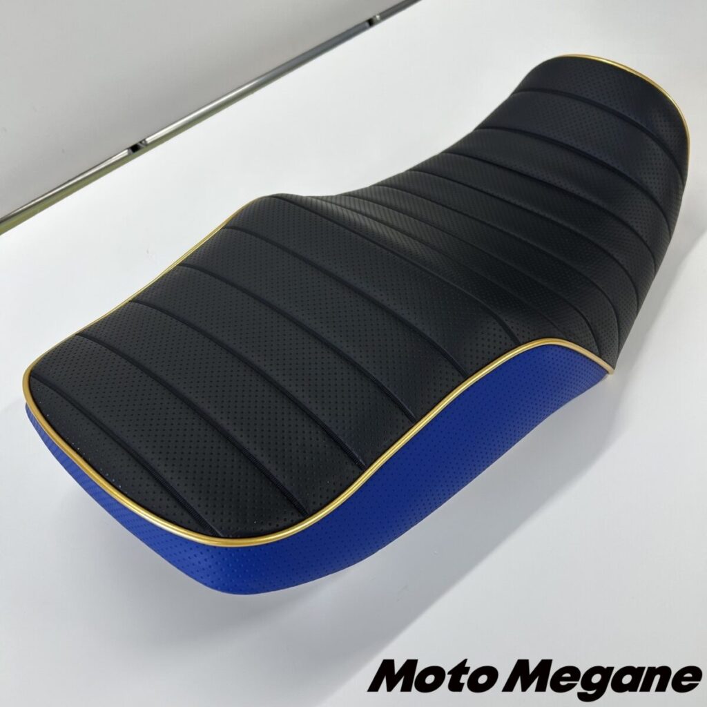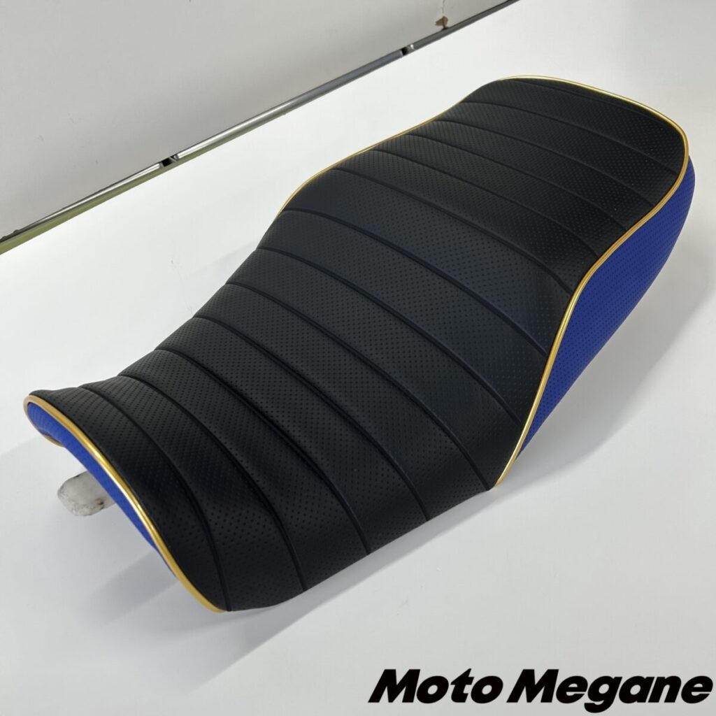 「Z900RSのときは、パイピングだけホワイトにした、シンプルなデザインにしました。でも今回は、他のカスタムパーツに使っているブルーをシートにも入れたかったので、つやの無いマット調のエンボスブルーに、車体に合わせた光沢のあるエナメル生地のゴールドを使いパイピングを施してもらいました」。