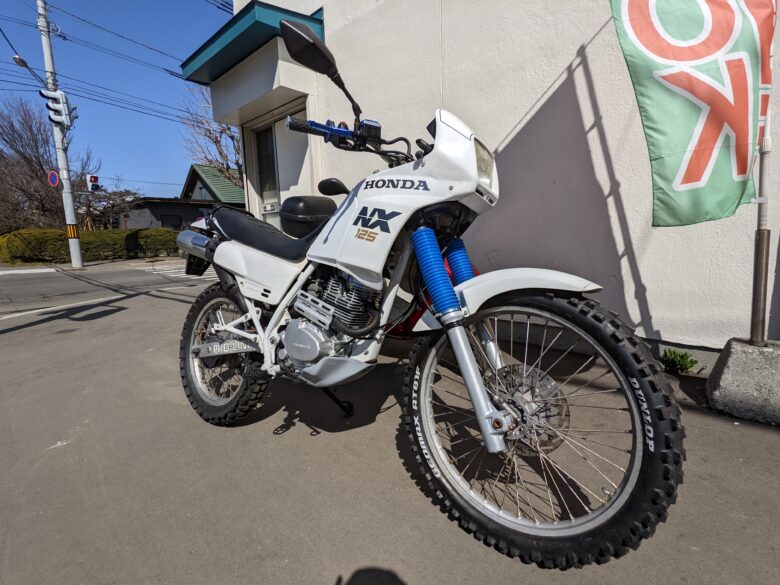 「NX125」は、1987年に発売された「デュアルパーパス」と呼ばれるモデルです。デュアル(dual)は「二重」「二者」、パーパス(Purpose)は「目的」「意図」という意味。オンでもオフでもOKというコンセプトです。