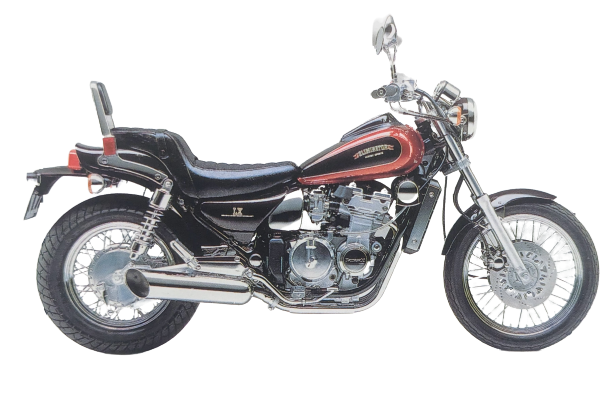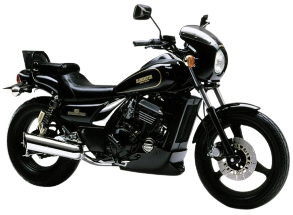 1986年にエリミネーター400、翌年にエリミネーター250が発売されました。デザインはエリミネーター900/750を踏襲していすが、扱いやすさを考慮してチェーンドライブが採用されています。アメリカンとは異なるロー&ワイドなスタイルと、スポーツモデルのエンジン (400ccはGPZ400R、250ccはGPX250R) を流用した鋭い走りで一躍人気になりました。