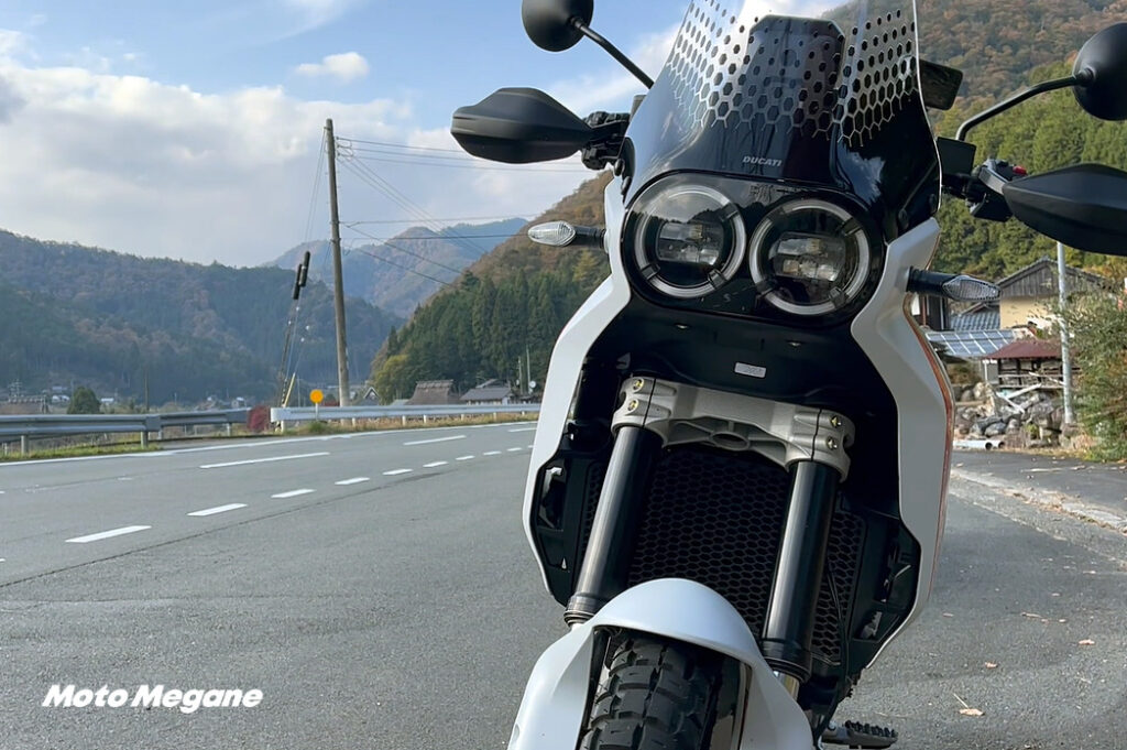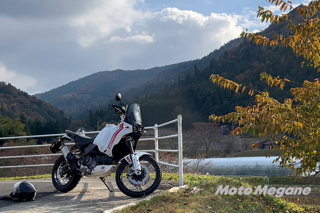 オフロードバイクらしからぬ旋回性を発揮する。フロント21インチ、リア18インチはドゥカティでは例がなかったが、実にスポーティーに曲がる。普通はフロントが残っていく感覚になるがそれがない。さすがドカ。電子制御も6軸IMUなどてんこ盛りなのも功を奏しているかもしれない。荒らしさを消したければ6つのライディングモードから選べばいい。でも、おすすめはスポーツモード。非日常が味わえる。