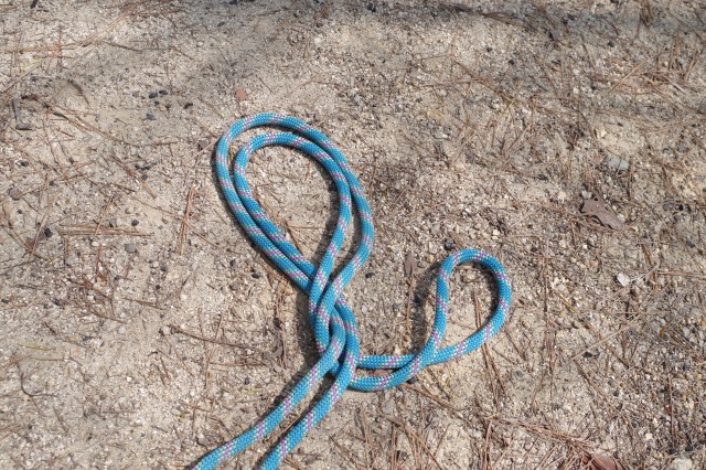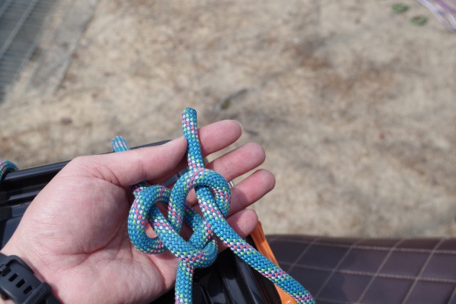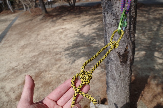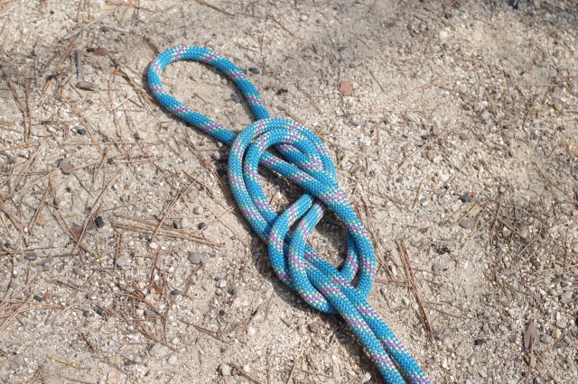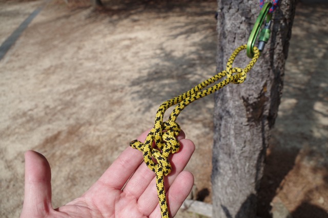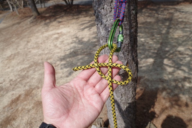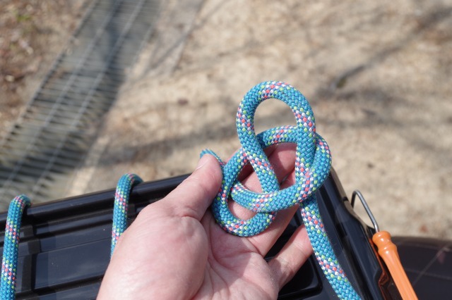まずはロープの末端のうちの一つにエイトノットという結び目を作ります。