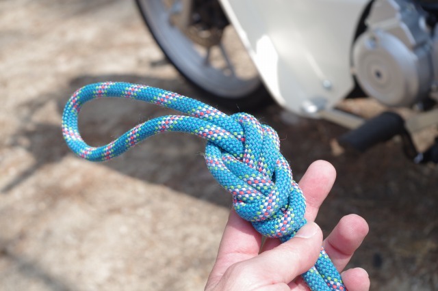 「こんなロープワーク、実際に使うの?」と思うかもしれませんがトラッカーズヒッチは僕が海外ツーリング中にバックパックをバイクに固定する時に。また、自在結びはタープの自在が壊れた時以外にもロングツーリング中に木と木の間にロープを張って洗濯物を干す時によく使います。