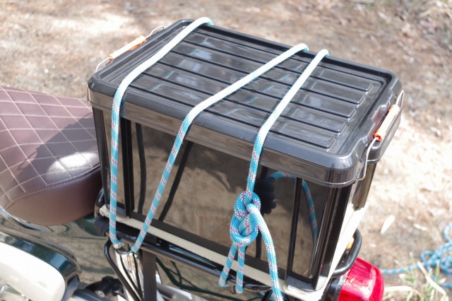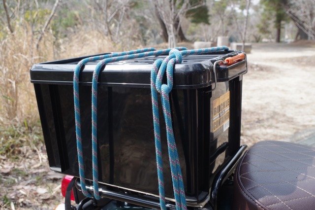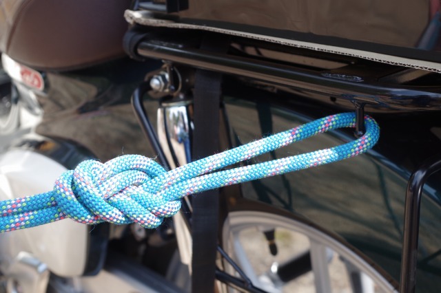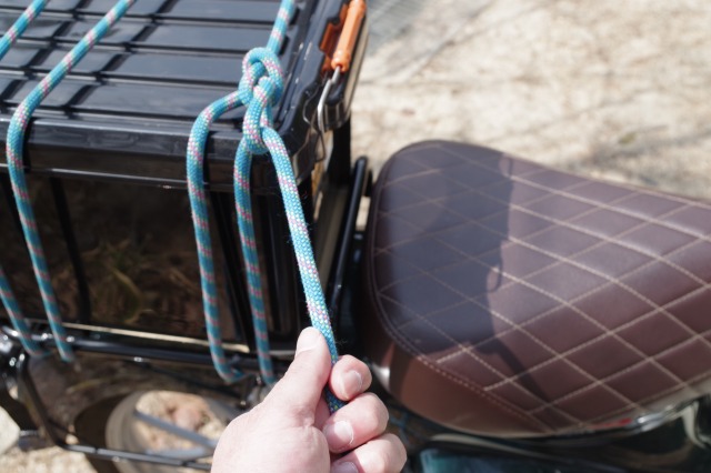 あとは末端をバイクのキャリアに結びつけるだけ。
