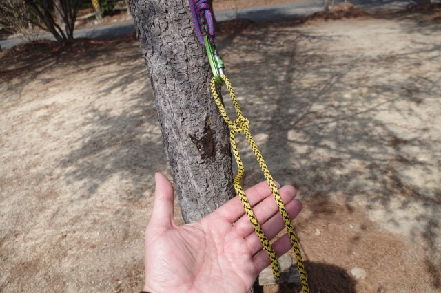 奥にカラビナが見えていますが実際は「地面に打ったペグ」と考えてください。