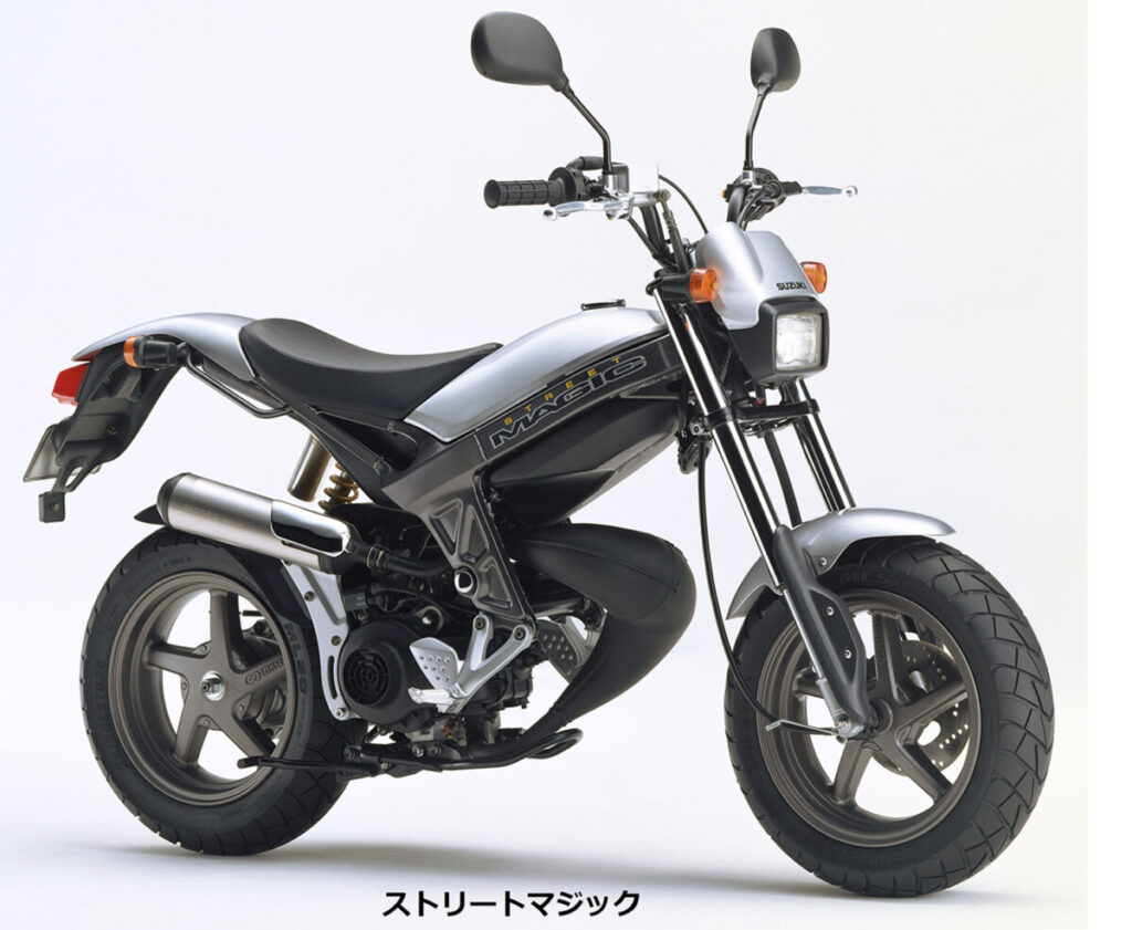 ストマジはスクーターのパワーユニットを、バイクのフレームに積み込んだ遊び心のある一台です。ミッションはオートマチックで、スポーツモデルの「ストリートマジックS」や、オフロードっぽくアレンジされた「ストリートマジックⅡ」、排気量を拡大した110ccも販売されました。カスタムしても楽しく、わりと人気がありましたが、2006年11月に自動車排出ガス規制の変更に伴い生産終了しています。