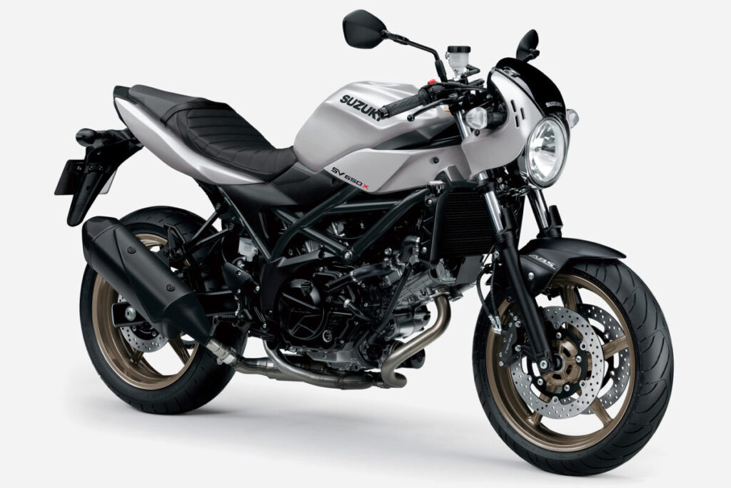 ヘッドランプカウルやセパレートハンドル、タックロールシートといったスポーツカスタムの要素を取り入れ、個性的でレトロな印象のカフェレーサースタイルのSV650X。写真は2023年の最新モデルだ。
