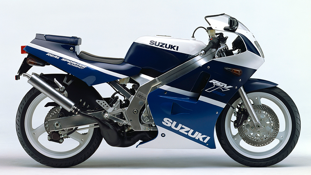 V型エンジンのロードスポーツモデルは、ロードレースGPマシン、RGV-Гの技術をフィードバックした2ストロークマシンの『RGV250Γ』が1988年に登場。