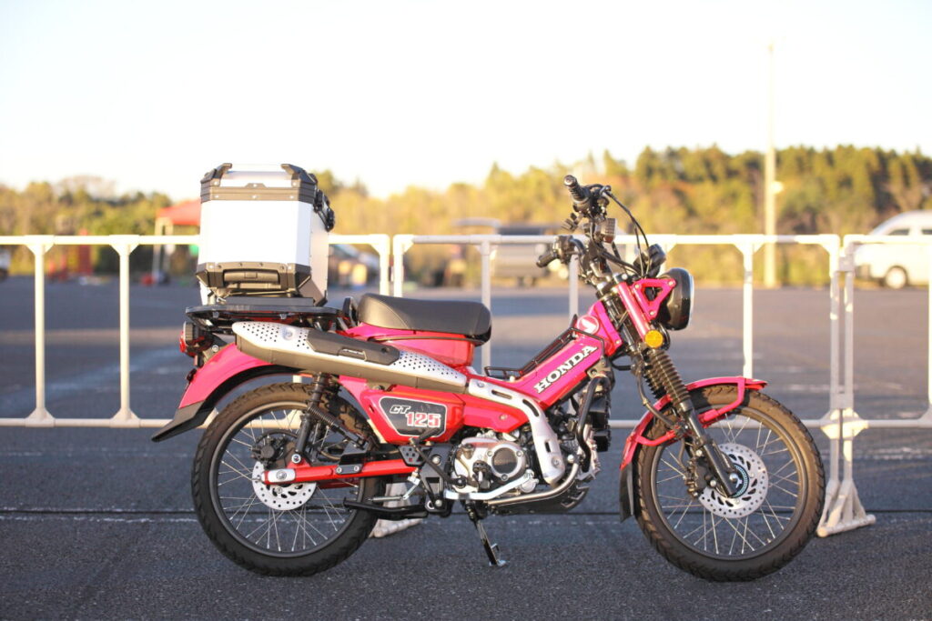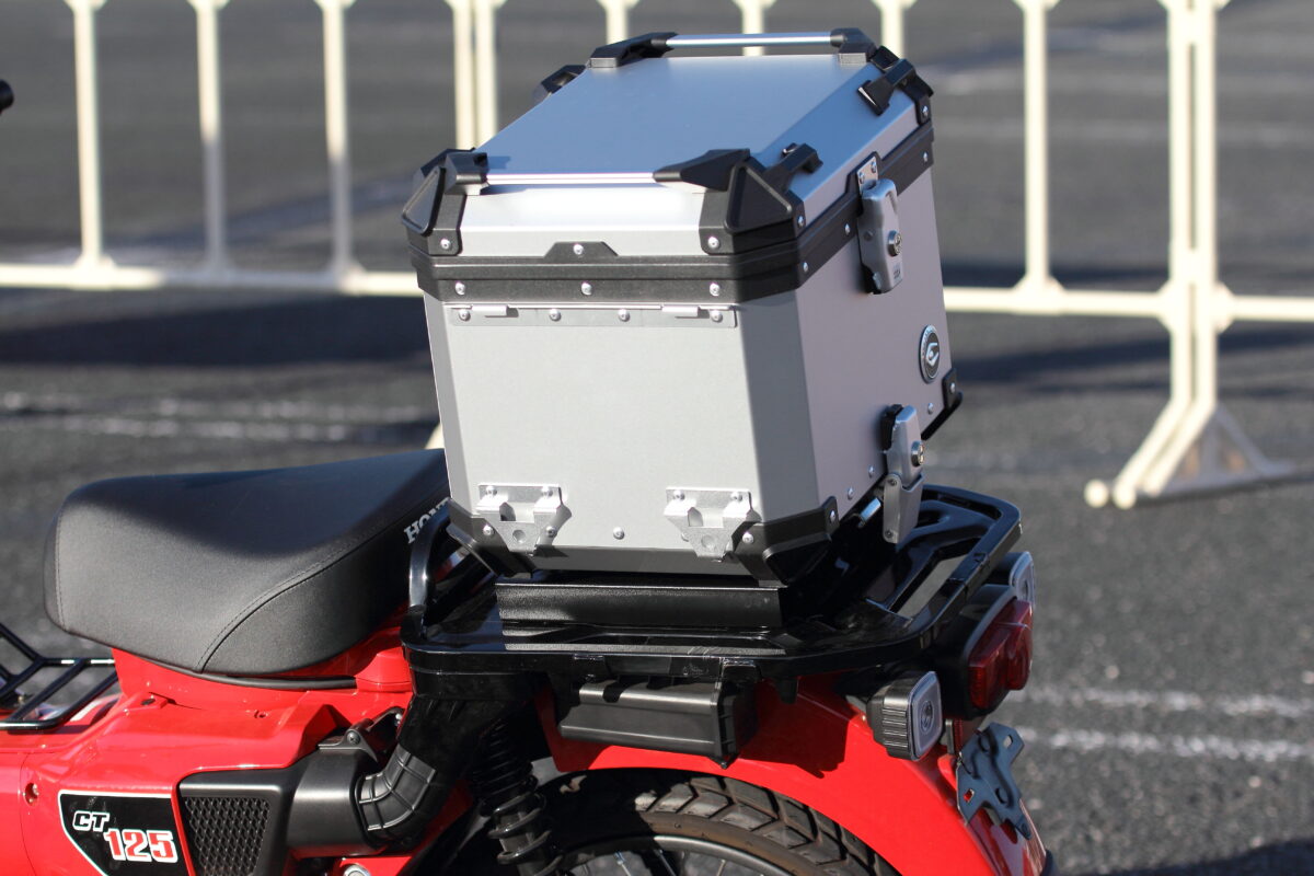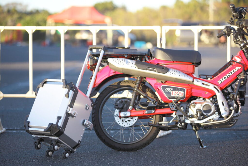 同製品は、小回りの利くダブル4輪タイヤのキャスター付きで、45L容量のアルミトップケースとなる。キャスターは脱着が可能で、5段階調整ができる引き延ばしハンドルも搭載しているのが特徴だ。快適なツーリングのお供として活用してみてはいかがだろうか。
