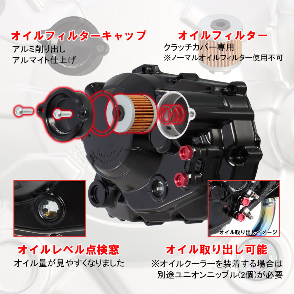 グロム用のアルミダイキャスト製のスポーティーかつ高品質なクラッチカバーです。オイルフィルターの内蔵やオイルクーラーの取り出し口を設け、レースからストリート車のカスタムまで幅広く対応。内部のクラッチ本体はノーマルクラッチに対応します。