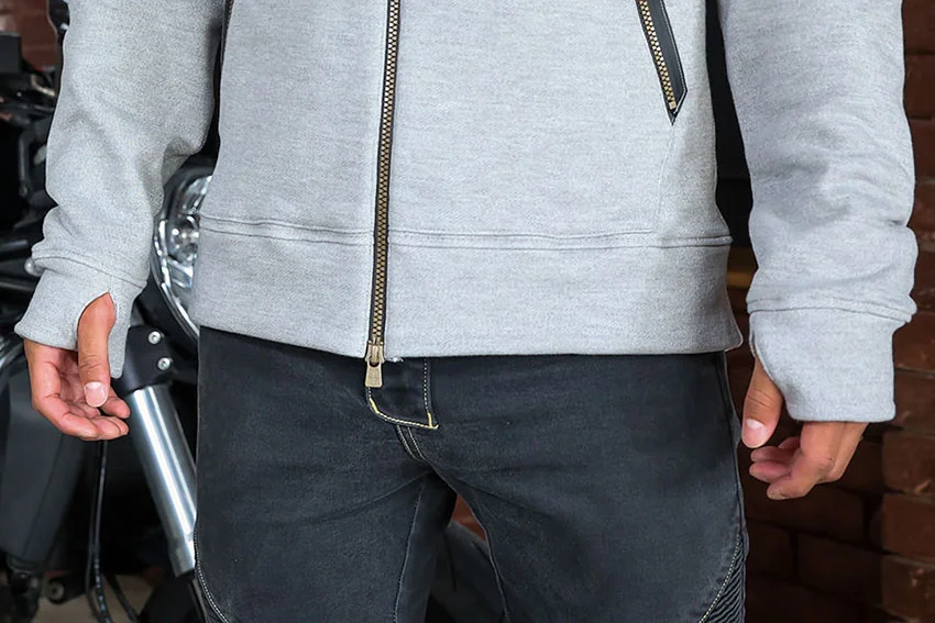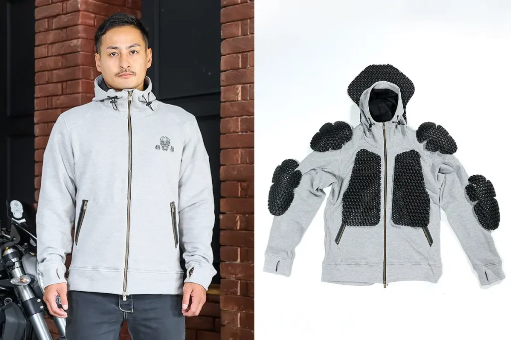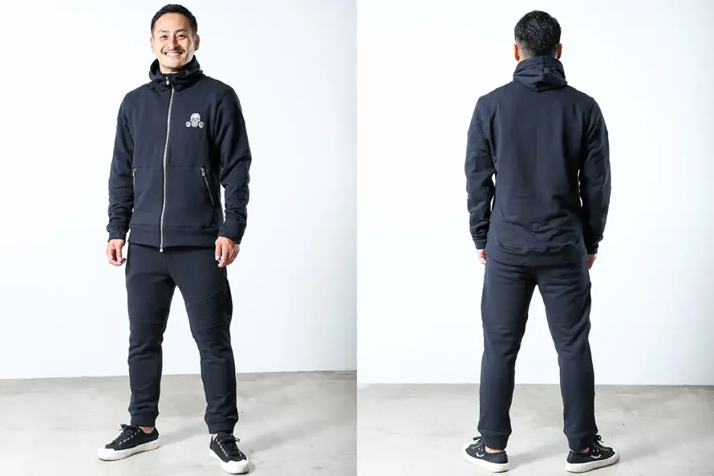 今回、新規プロジェクトを実施するのはメンズライダー向けの「ふとした時、気軽にバイクに乗れる」プロテクター入りスウェットパーカー&パンツです。以下の3点が大きな特徴です。