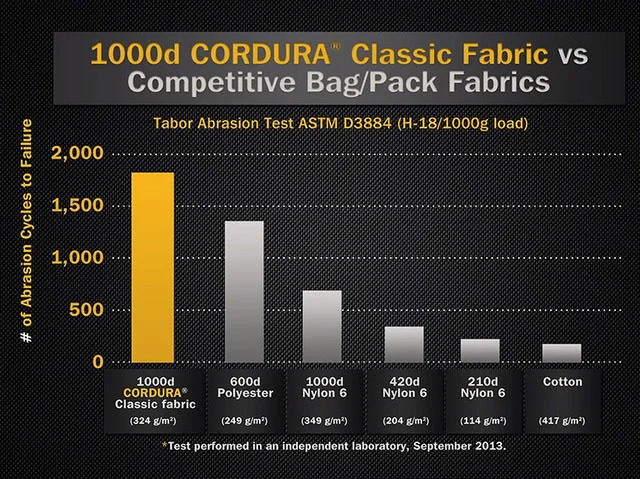 CORDURA®︎(コーデュラ)は、強度と耐久性に優れたファブリックに対するインビスタ社の登録商標です。一般的なコットンと比べて非常に優れた強度と耐久性、アスファルト等の摩擦に耐える、耐摩耗性持つ生地繊維です。