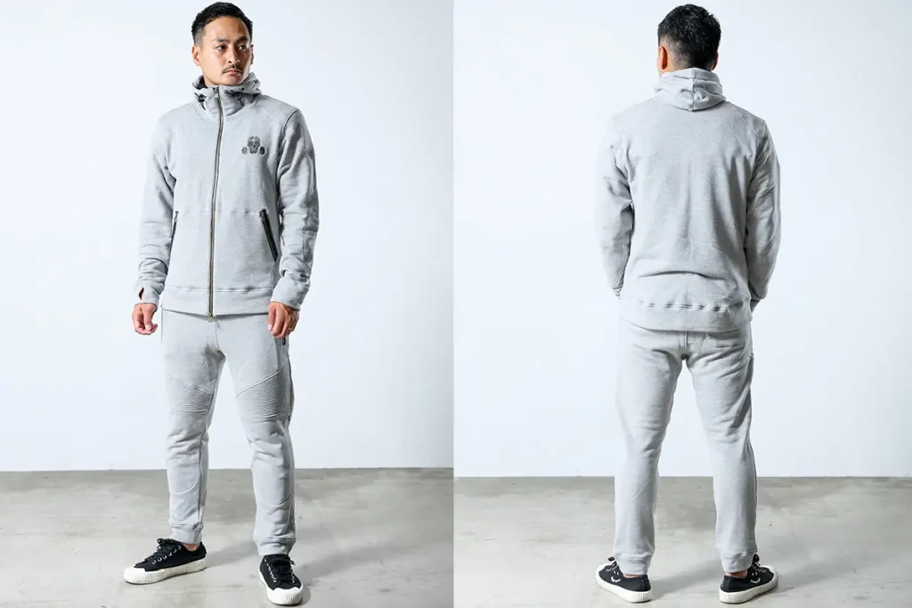 スウェットパーカー&パンツは各種「ブラック」「グレー」の2色展開。プロテクターは同梱・別売りをお選びいただけます。