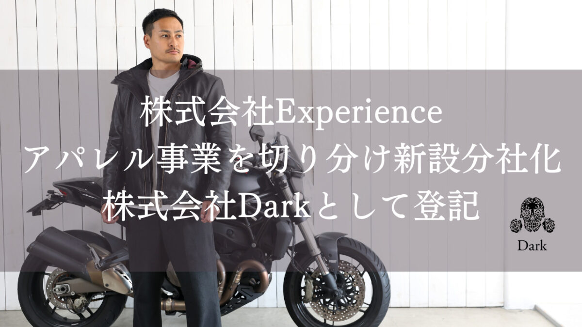 バイカー&ライダース向けのハイエンドなファッションブランドを企画・販売する株式会社Darkは、株式会社Experienceよりアパレル事業を切り分け、2023年2月1日に登記したと発表した。理由には、PL/BSにおける責任の明確化、デット及びエクイティの資金調達、販売及びプロモーションに尽力することなどがあげられた。今後はアパレルの製品企画・販売業だけでなく、マーケティングとしてメディアコンテンツ資産の構築や、ユーザーと双方向のプロモーション強化などに力を入れるとしている。