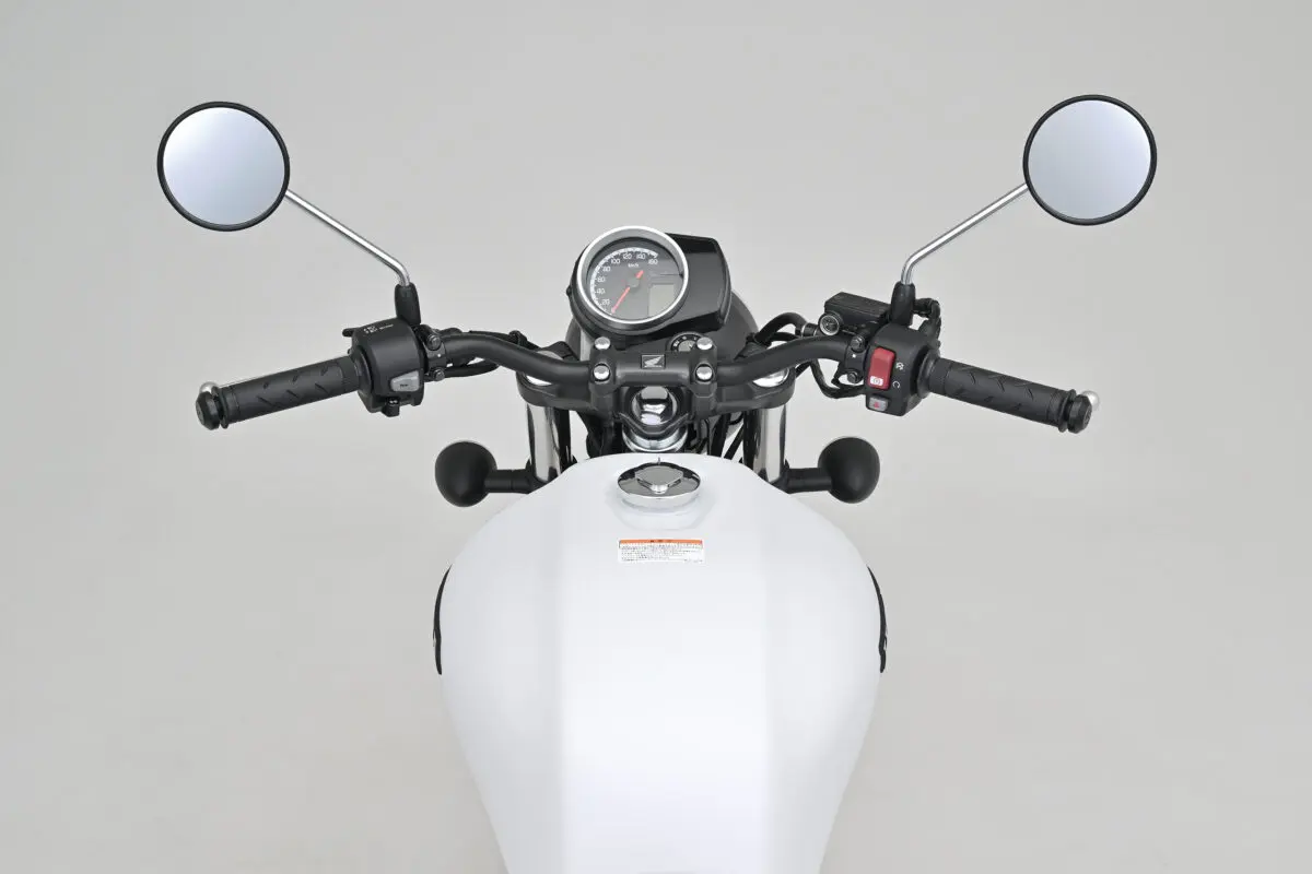 純正ハンドルよりグリップ位置を15mm低く、手前内側に絞ることで生まれる程よい前傾姿勢がスポーティ。エンド部には6mmネジ穴加工済みで、純正のバーエンドの他にM6サイズのバーエンドミラーアダプターが装着可能です。全高+−40mm/全幅+−20mmの継続検査基準値内(※)に収まる設計のため、記載変更等は必要ありません。