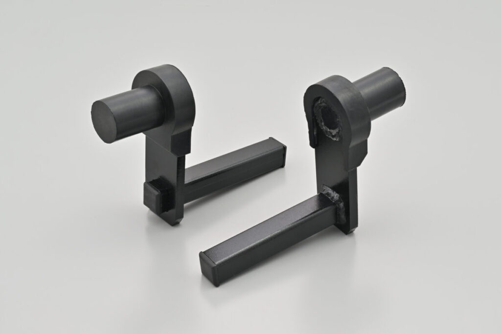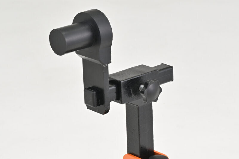 当社アジャスタブルリアスタンドⅢシリーズのスタンドに取り付けることにより、角型スイングアームのダウンマフラーの車両に最適です。オフセットアタッチメントによりマフラーの脱着をせずに車両のリフトアップが可能になります。ゴム型一体成型のため、ゴムが抜けにくい構造で、強度を上げるために受け部分に直接の溶接ではなく、穴あけ差し込み後の溶接を行っています。