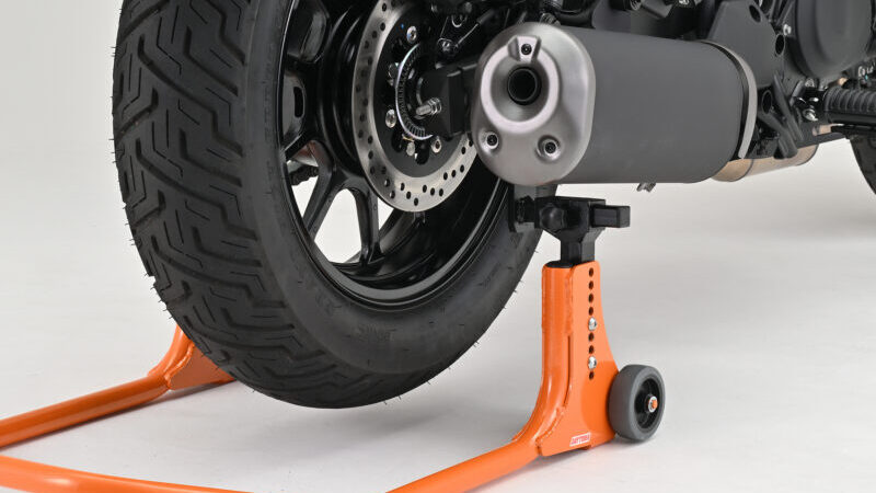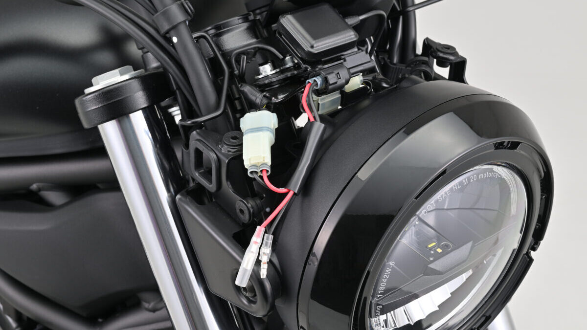 同社のアジャスタブルリアスタンドⅢシリーズのスタンドに取り付けることにより、角型スイングアームのダウンマフラーの車両に対応したオフセットアタッチメント 角型スイングアーム用は4,400円。純正オプションカプラー作動用リレー付属で、配線を加工することなく電源の取り出しが可能なかんたん! 電源取出しハーネスは5,060円(いずれも税込)。