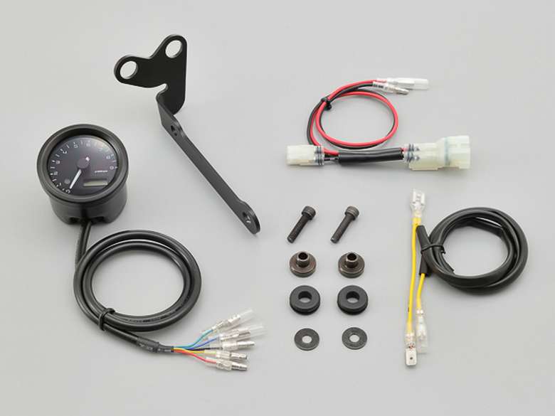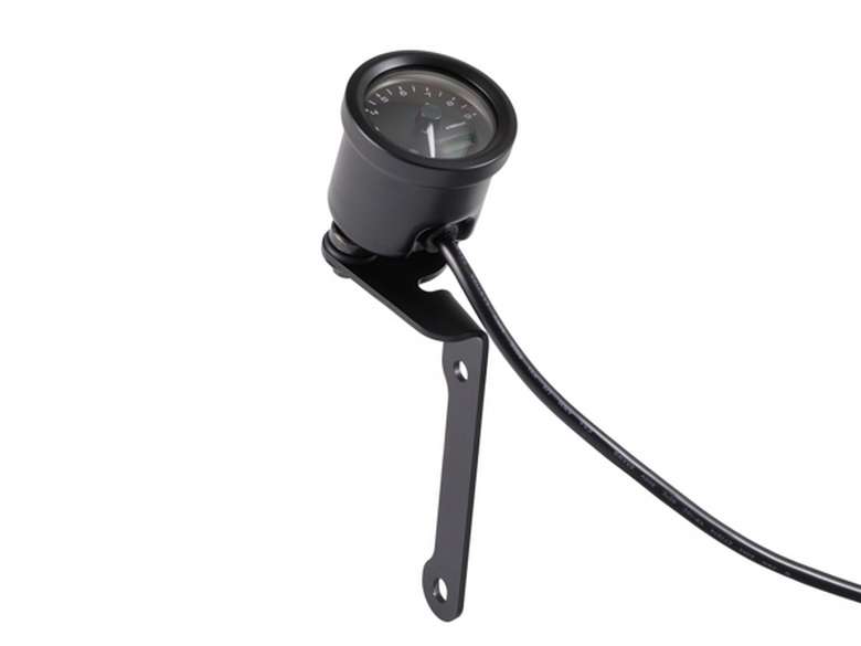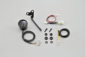 純正スピードメーターの左側に、小径の「VELONA」φ48タコメーターをバランス良く装着できる。タコメーターは、9000rpmブラックボディ/ブラックパネル。取り付けステー、専用ハーネス付属でボルトオン装着が可能。メーターステーは防振対策のためラバーマウントを採用している。