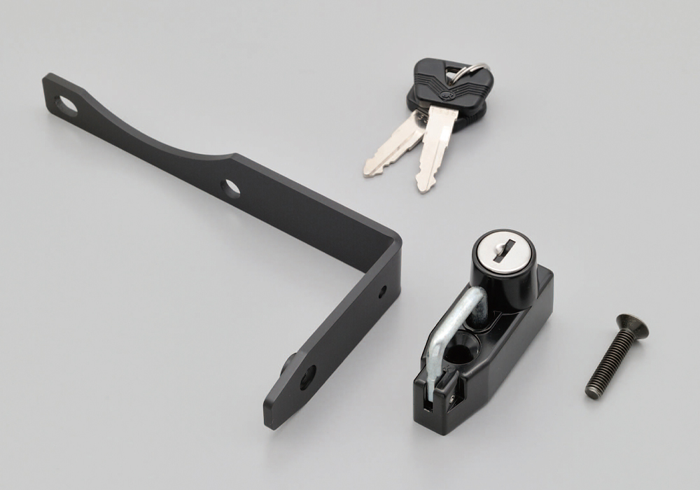 ヘルメットホルダーが純正で装備されていない車両にボルトオンで装着できるヘルメットホルダー。