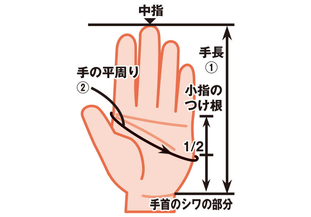 ●当社グローブの種類、素材によってフィット感が異なります。また、手のサイズには個人差がありますので、グローブ基準サイズ表とグローブのタイプによりお好みのサイズ感をお求めください。