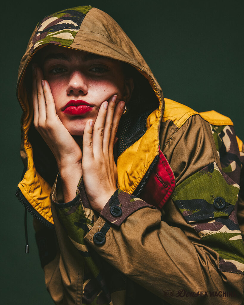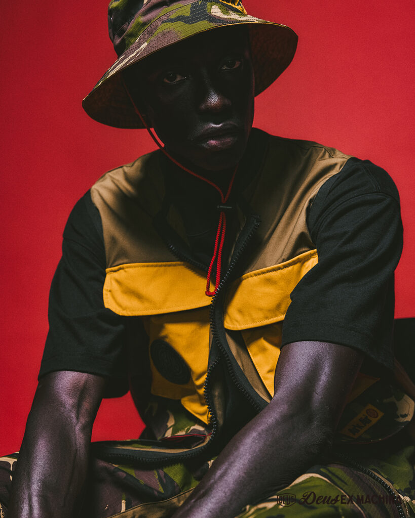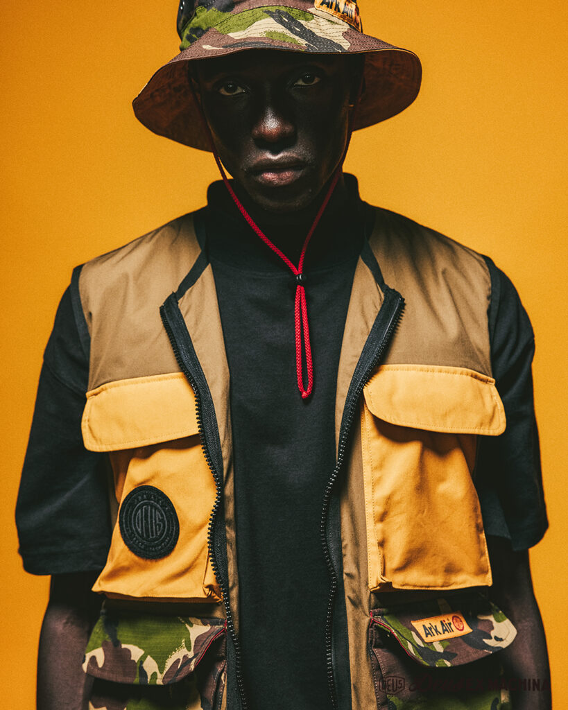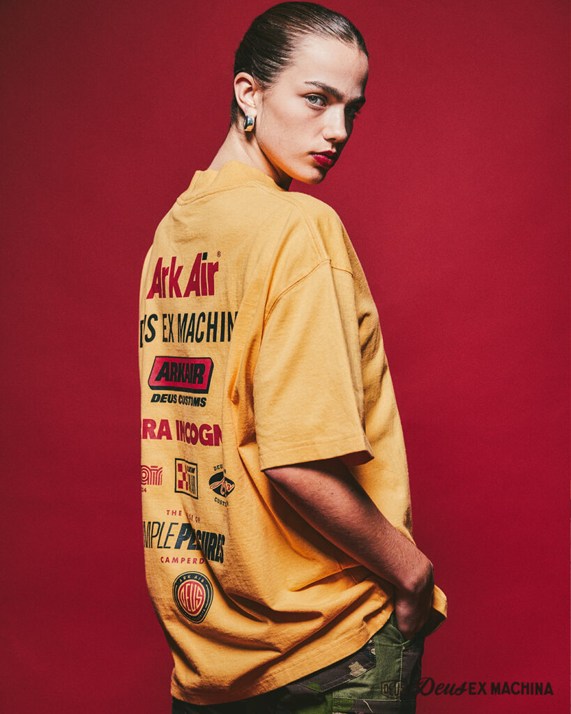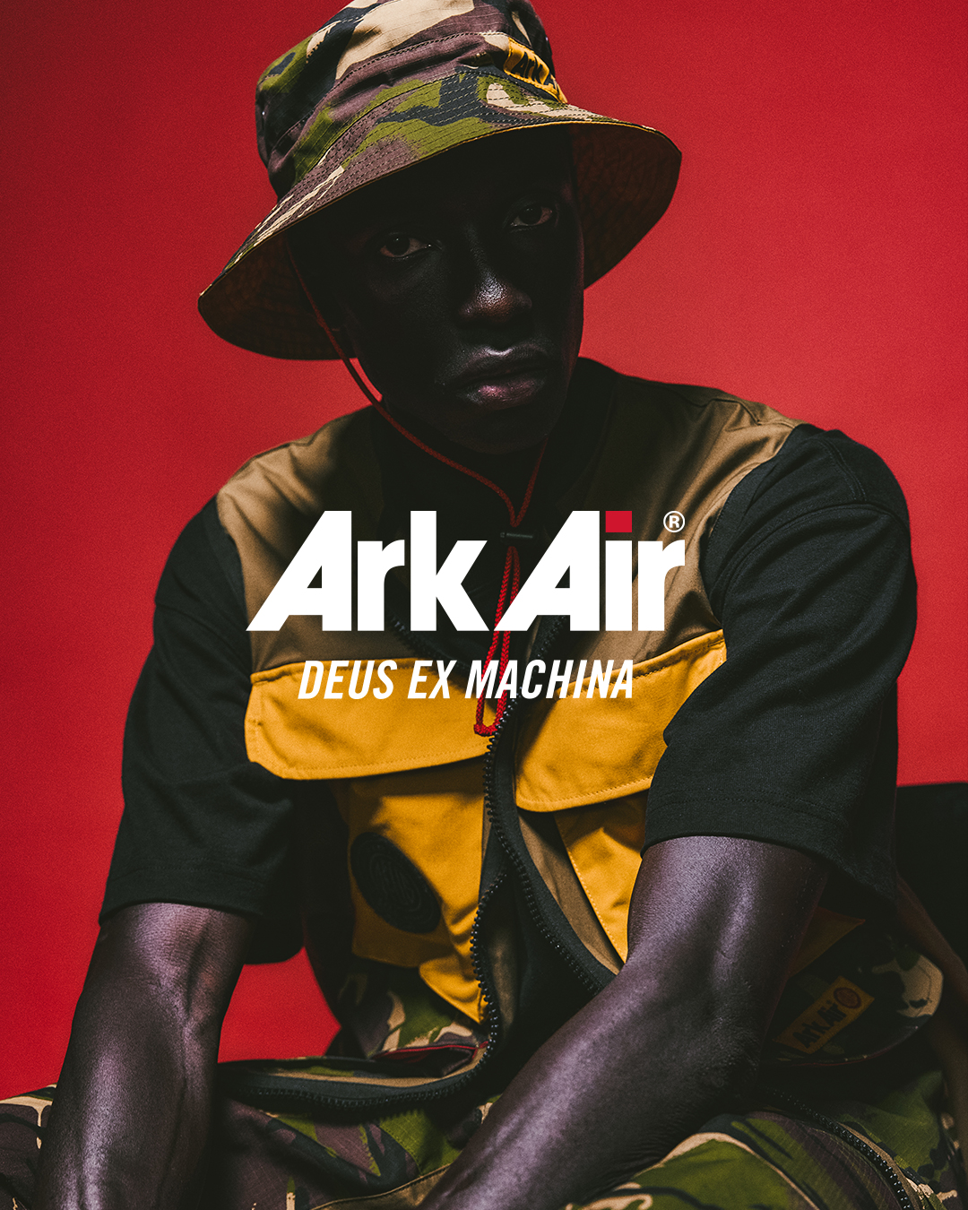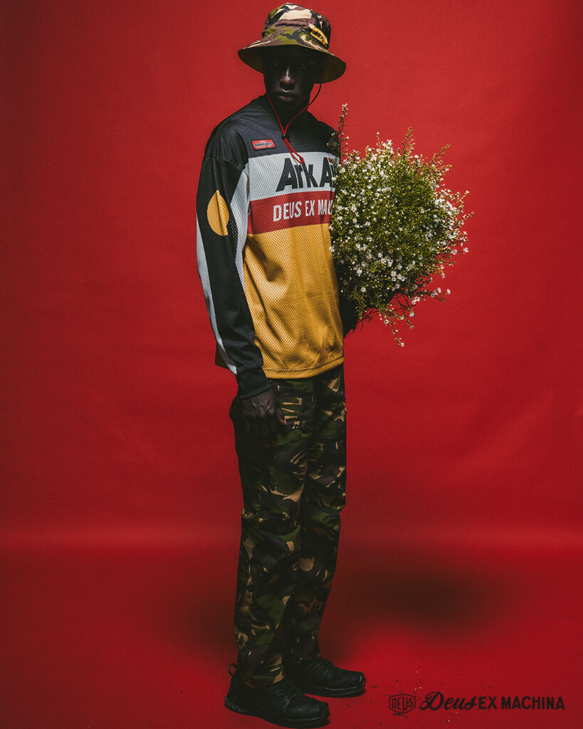 約40年にわたり世界中の軍隊や特殊部隊に向けてタクティカルウエアを提供してきた英国Arktis社が、その生産技術を活かしてタウンユース向けに製作したレーベルです。そんな背景を持つArkAirは頑丈な縫製や生地使いによるミルスペック由来の作りが最大の魅力となっています。今回のコラボレーションでは、ミリタリースモックをはじめArkAirらしい英国ミリタリースタイルをイメージ。DPM迷彩柄やODカラーの生地、鮮やかなイエローの生地をアクセントに、パーツごとに生地を切り返しDeusらしいポップな印象を打ち出しました。またArkAirとDeusのネームをプリントしたモックネックTシャツやモトクロスジャージなど、よりスポーティなアイテムも展開しています。