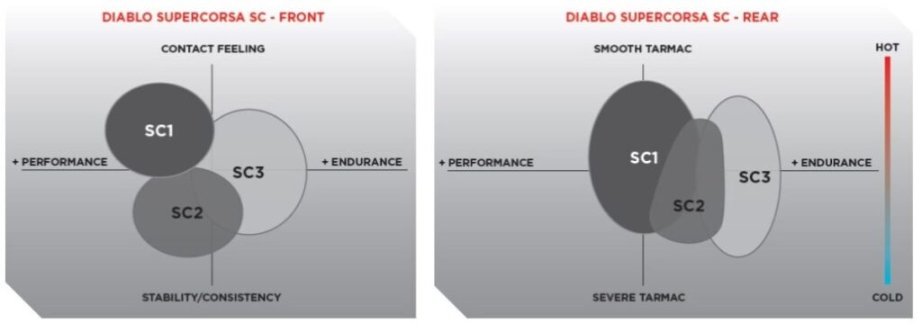 ⚫SC1 – フロント:コンタクトフィーリング重視 / リア:パフォーマンス重視だが、寒冷時や荒れたアスファルトには向いていない。