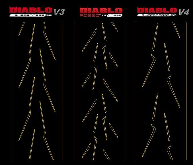 DIABLO™ SUPERCORSA V3 と比較して、DIABLO™ SUPERCORSA V4 は、新しいトレッドパターン、新しいコンパウンドとコンパウンドレイアウト、新しい構造、新しいプロファイルを備えています。