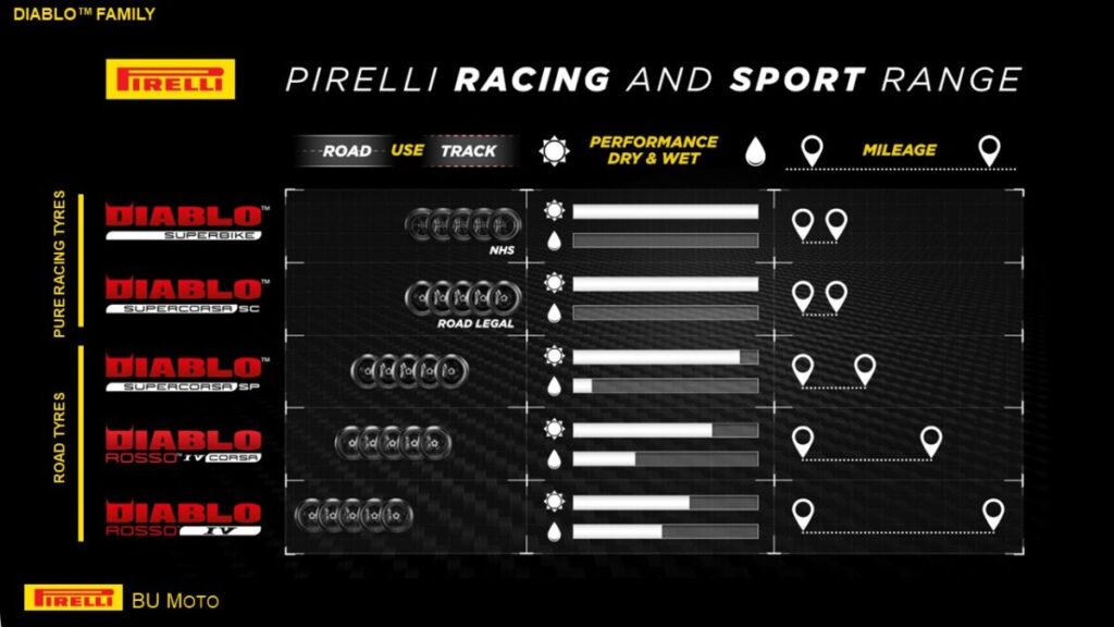 第 4 世代の DIABLO™タイヤは、ベースとなる DIABLO ROSSO™ IV、よりハイグリップな DIABLO ROSSO™ IV CORSA、レーストラックでの性能をロードでも発揮する最高級の DIABLO™ SUPERCORSA V4 SP と、ライダーに異なる選択肢を提供するハイパースポーツ・タイヤになっています。