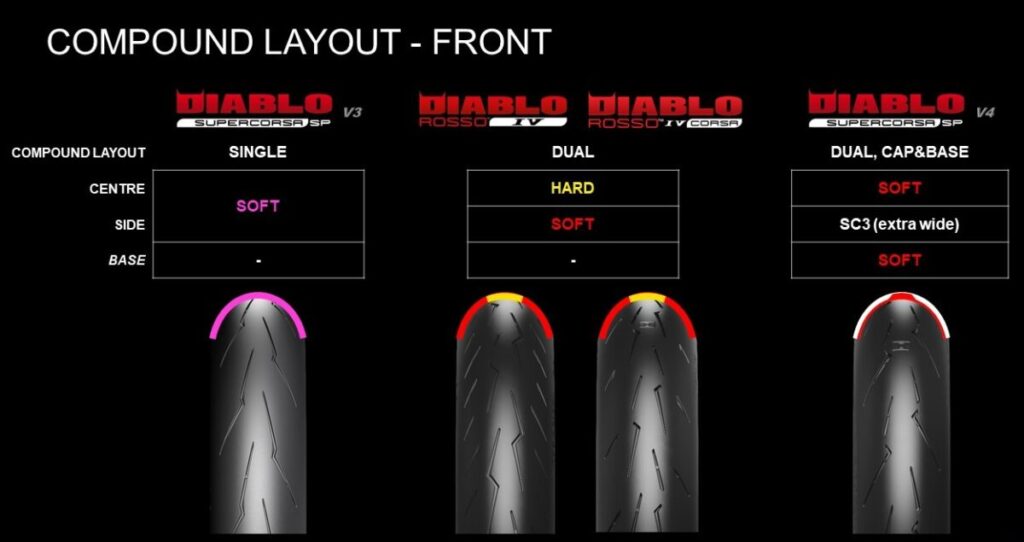 ⚫DIABLO™ SUPERCORSA V4 SPは、フロントとリアの両方にデュアルコンパウンドレイアウトを採用しています。