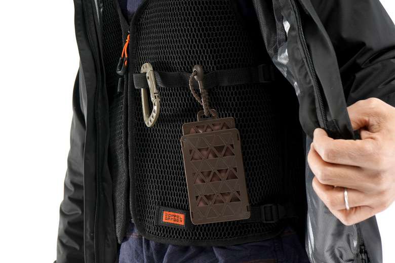 様々なコードを通したりカラビナを吊ることができるデイジーチェーン。夏でも長袖を着たほうがよい草刈りなどの屋外作業で、携帯用の虫よけ剤をデイジーチェーンにつけて携行することもできる。