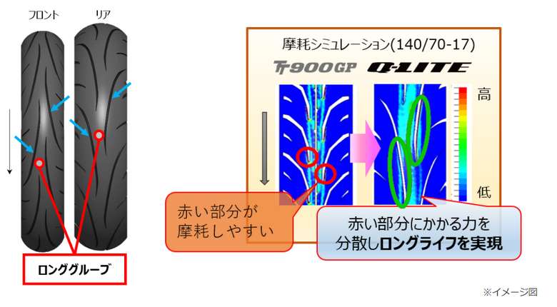 全てのバンク角で接地面を貫くロンググルーブはトレッドセンターからショルダーにかけて角度を変化させることで高い排水性能を実現しながら、摩耗シミュレーションによりグルーブ形状と角度を最適化し、偏摩耗を抑制することでライフ性能を向上させている。