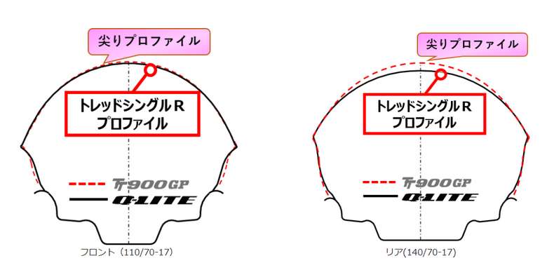 トレッド断面の曲率半径が均一なシングルRプロファイルを採用し、旋回時の接地形状の変化を抑制することで、従来品※より旋回中のコントロール性能を大幅に向上。リニアなハンドリングにより、あらゆるバンク角で思い通りに動かせるコントロール性能を実現した。