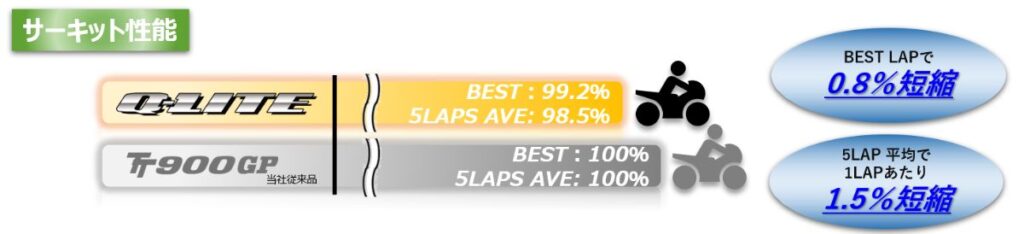 【試験方法】●同一車両にQ-LITEとダンロップの従来品を装着して同じ走行枠にて走行。同一ライダーによるBESTLAP/計測1周目を除いた5LAP連続走行での平均を比較。