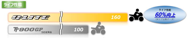 【試験結果の表示方法】●リアタイヤのセンター部近傍のウェアーインジケーター上の溝深さを新品時&1,200km走行後に測定し、次の計算式によりタイヤライフを推定し従来品との比率で表示。タイヤライフ(リア)=新品時溝深さ×(1,200km/摩耗量)※摩耗量=新品時溝深さ-1,200km走行後溝深さ