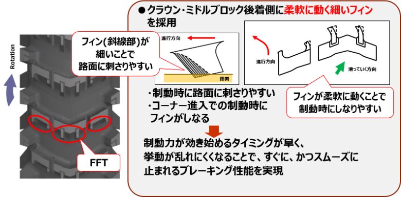 クラウン・ミドルブロック後着側に、柔軟に動く細いフィンを採用することで、フィンが路面に刺さりやく、制動力が効き始めるタイミングを早めた。さらに、コーナー進入のブレーキング時にフィンがしなることで、挙動が乱れにくく、すぐに、かつスムーズに止まれるブレーキング性能を実現した。