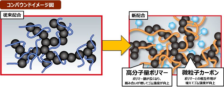 トレッドコンパウンドにゴム強度を向上させる高分子量ポリマーと微粒子カーボンを採用することでトラクション性能を向上した。