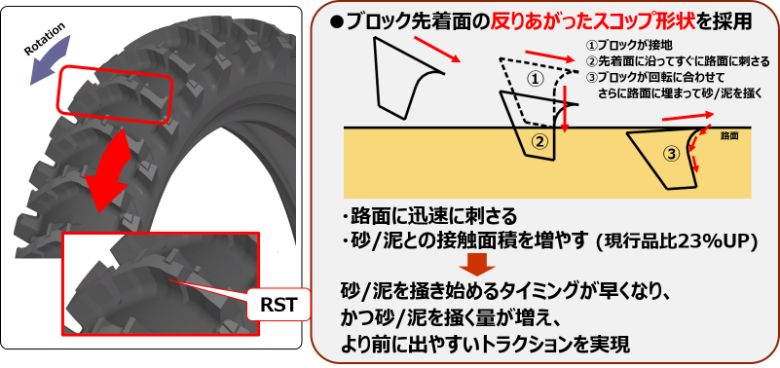 ブロックに先着面が反りあがったスコップ形状を採用することで、路面に素早くブロックが突き刺さり、砂・泥を掻き始めるタイミングを早めるとともに、接触面積を増やすことで、トラクション性能を向上した。