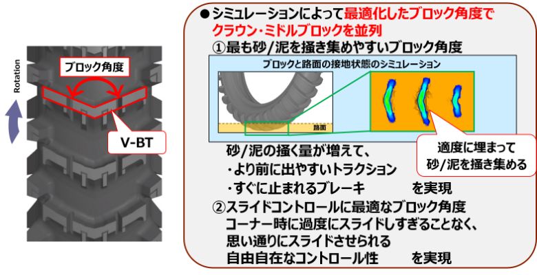 ブロックを最も砂・泥を掻き集めやすく、かつスライドコントロールしやすい角度に最適化し、トラクション性能、ブレーキング性能、スライドコントロール性の向上を実現しました。