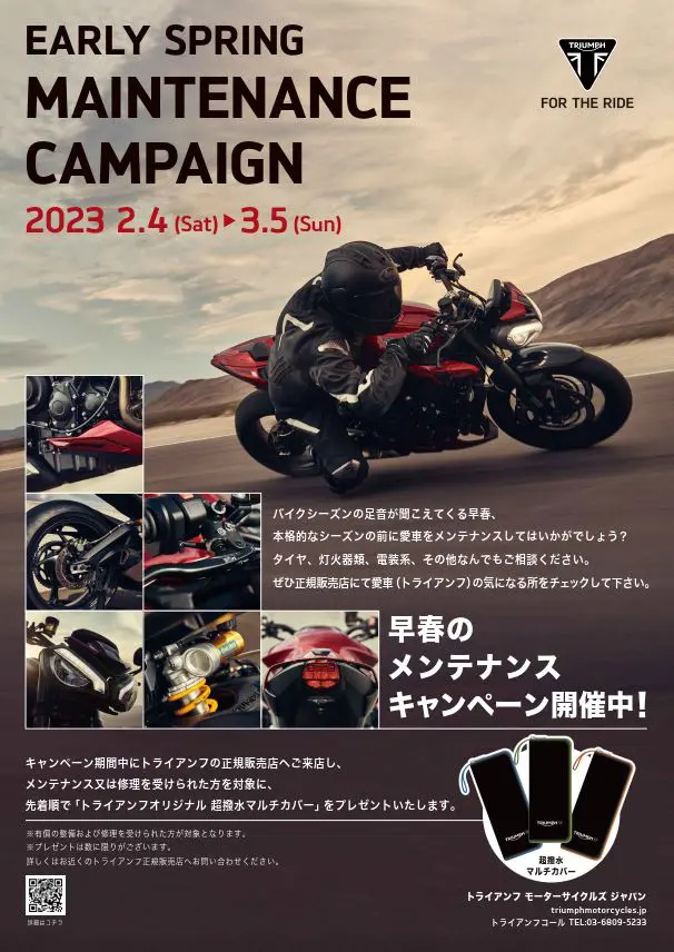 トライアンフモーターサイクルズジャパン株式会社は、ユーザーへ車両の点検・整備を勧める「アーリースプリング メンテナンスキャンペーン」を、2月4日より全国のトライアンフ正規販売店において開催する。期間中、正規販売店にて有償の整備や修理、初回点検を受けたユーザーには「トライアンフオリジナル 超撥⽔マルチカバー」が先着でプレゼントされる。