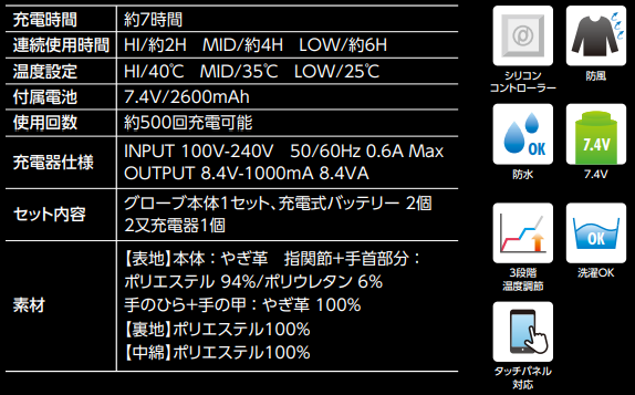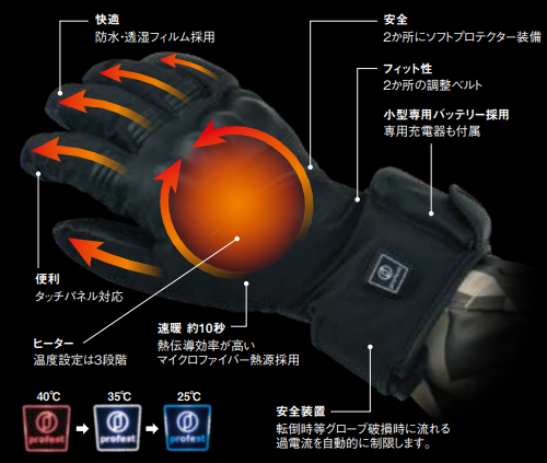電熱グローブ、専用リチウムバッテリー、専用充電器付属