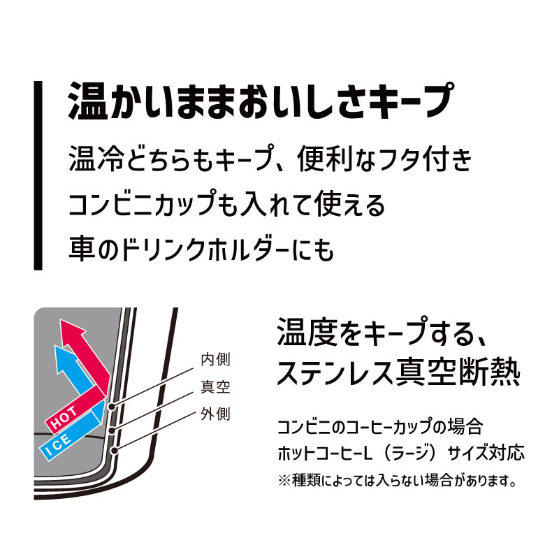 またコップのように直飲みでも使うことができる他、コンビニのカップドリンクのホルダーとしても使用可能の3WAY仕様となっています。(ホットコーヒーLサイズ、アイスコーヒーRサイズ対応。※すべてのカップに対応できるわけではありません)