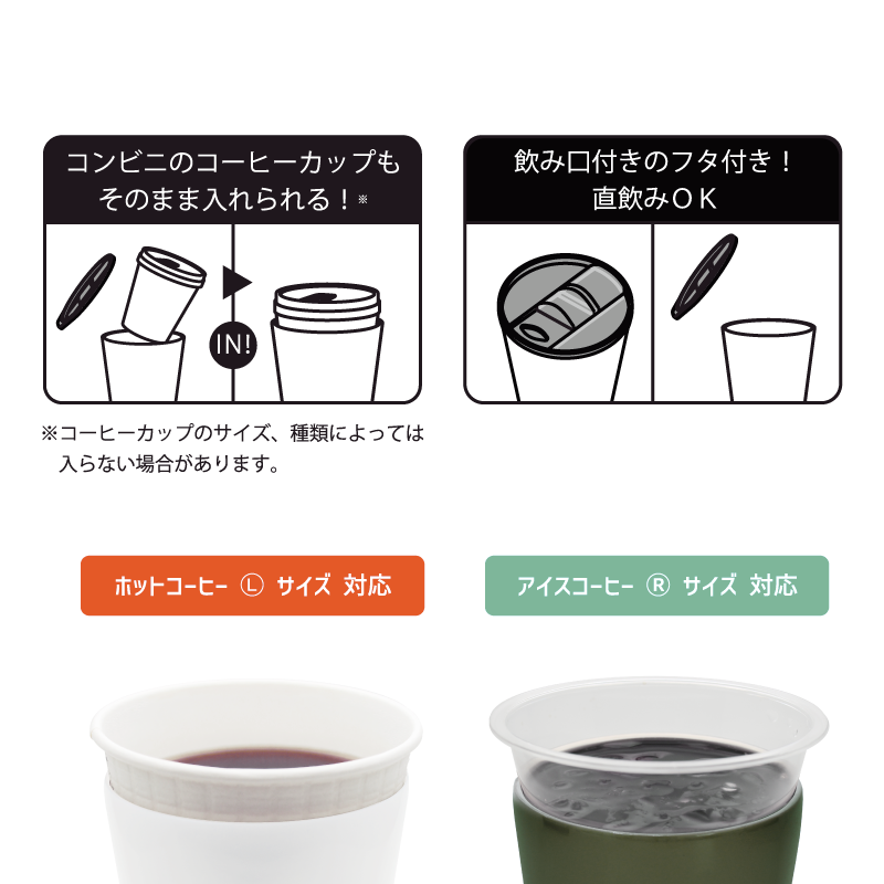 またコップのように直飲みでも使うことができる他、コンビニのカップドリンクのホルダーとしても使用可能の3WAY仕様となっている。(ホットコーヒーLサイズ、アイスコーヒーRサイズ対応。すべてのカップに対応できるわけではありません)