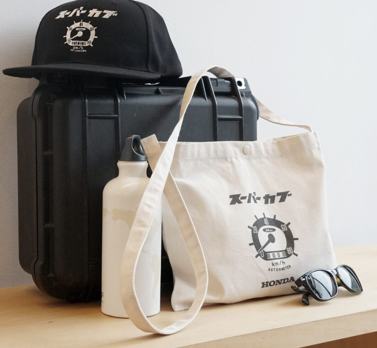 スーパーカブのイラストが入ったTシャツ、トートバッグ、キャップが店頭に並びます。