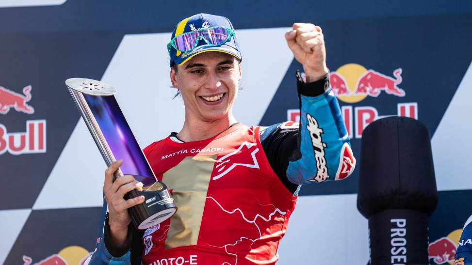 シーズン後半、マッティアは再び主役となるためにレースに現れた。これまでの 7 レース中 5 勝、2 回の表彰台を獲得し、今年度 MotoE 世界選手権で非常に印象的とも言える勝利を収めた。9 月 9 日には地元サーキットでもチャンピオンに輝いている彼のレースナンバーは No.9 である。